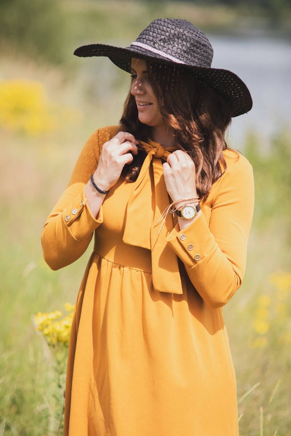 Deze hele gave oker gele jurk is zeer geschikt voor een buiten shoot. Zowel in de herst wanneer de blaadjes hun warme kleuren krijgen als in de lente tussen het heidegras.
